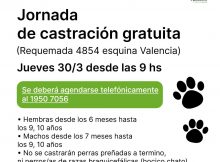 El jueves 30 de marzo desde las 9 hs se realizará una jornada de castración gratuita para perros y gatos en Requemada 4854 esquina Valencia La castración es